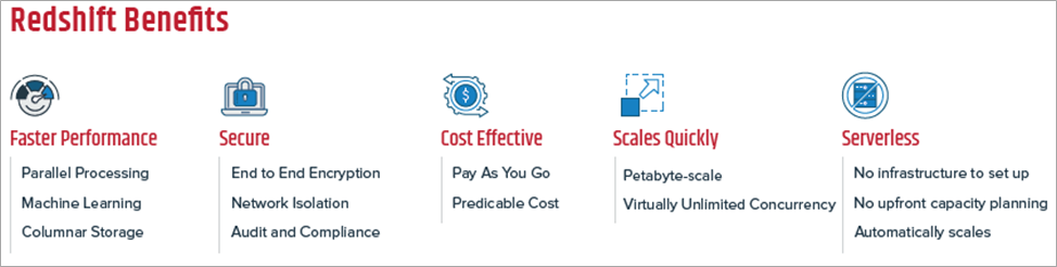 Amazon Redshift can provide organizations with a scalable, flexible, and cost-efficient cloud-based platform that brings together all the data—structured, semi-structured, and unstructured—in one console view.