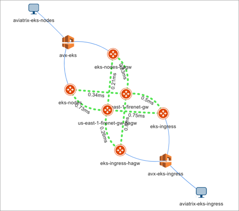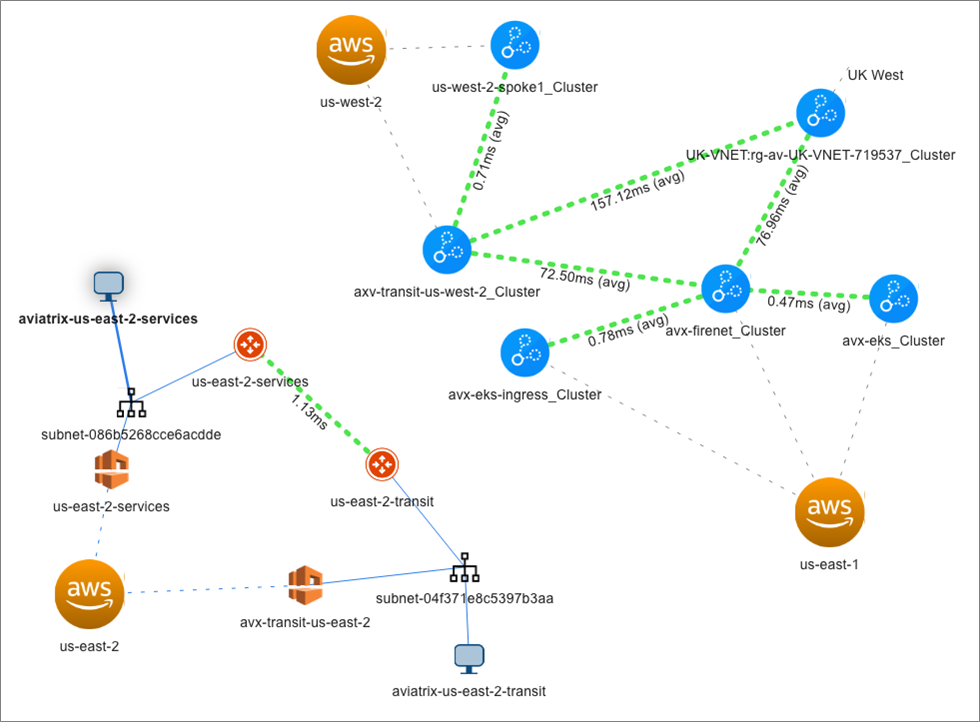 You can select any two instances that are a part of the Aviatrix Platform to get a view of the traffic path along with performance metrics. The generic “my app is slow” or “the network is slow” complaints can be easily confirmed or dismissed.
