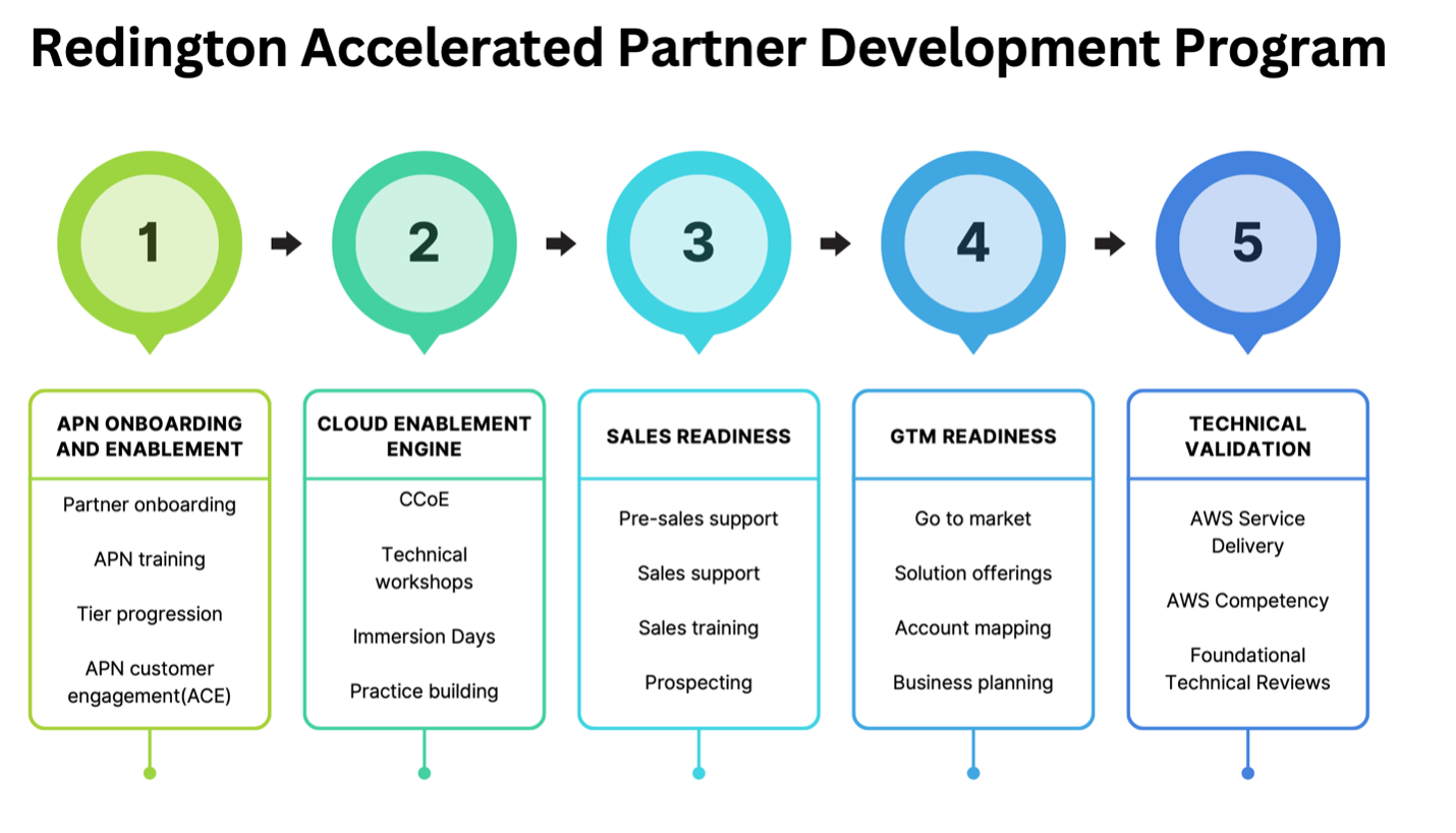 Redington: Partners grow their business on AWS in multiple ways via the distribution strengths of Redington. We have curated a partner development program in alliance with AWS called the Accelerated Partner Development Program. This program is split into five milestones: APN Enablement, Cloud Enablement Engine, Technical Validation, Sales Readiness, and GTM Readiness.