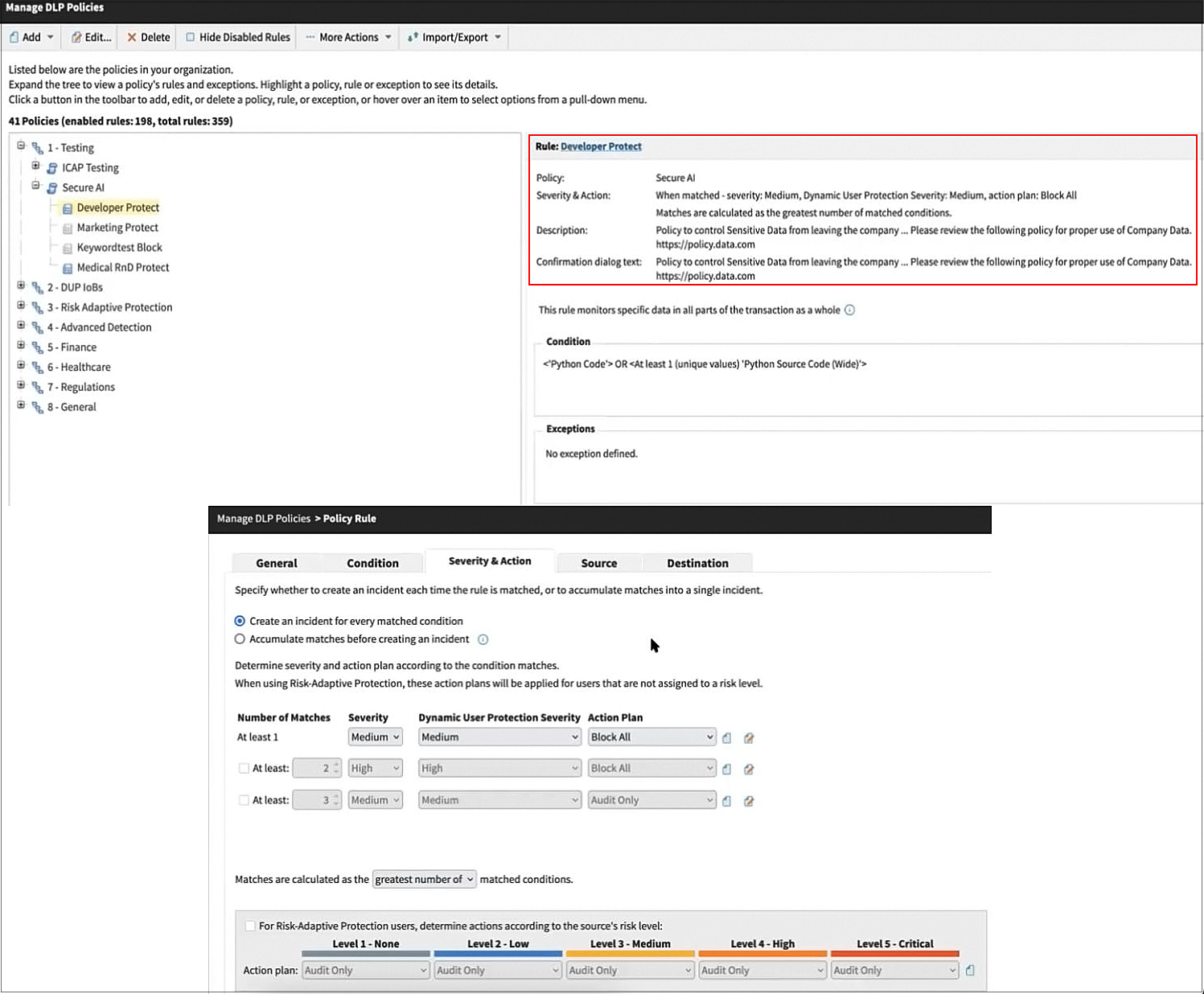 In Figure 3, we see the Forcepoint Security Manager, creating and managing data usage policies. The outlined section shows rules designed to protect your organization’s internal data from being exfiltrated to or from AI systems.