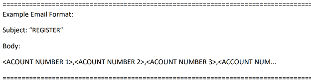 The first account number in the list should be the account you plan to use to access your IAM data stream. The subject of the email should be “REGISTER.” You must use the email that you used to register with IAM Health Cloud.