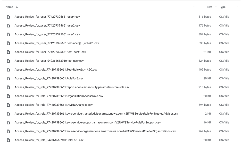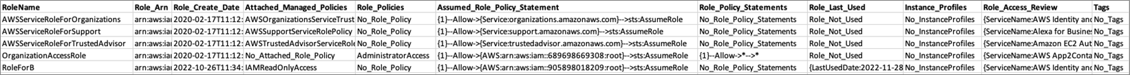 IAM Health Cloud provides pre-parsed CSV reports with detailed information about users, accounts, policies, and roles which include a compliance and risk analysis for each.