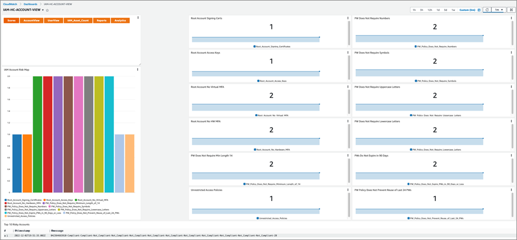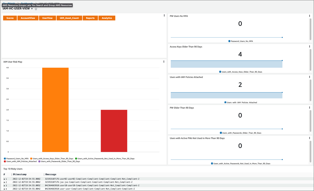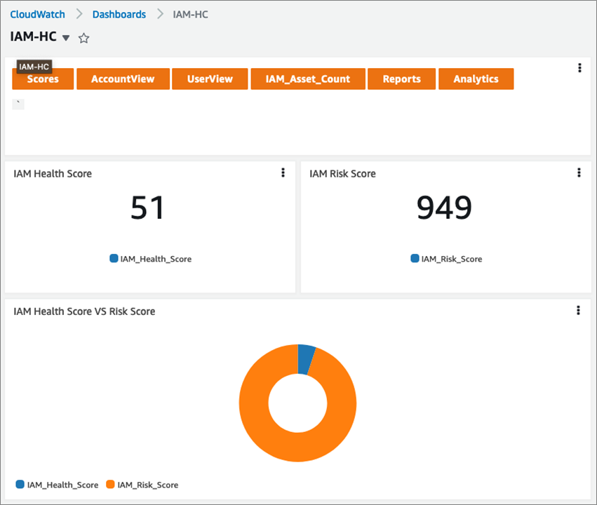 IAM Health Cloud provides compliance analytics to easily identify and evaluate users and accounts according to Center for Internet Security (CIS) best practices. The information is pushed directly to Amazon CloudWatch dashboards for authorized users to quickly understand the content at a glance.