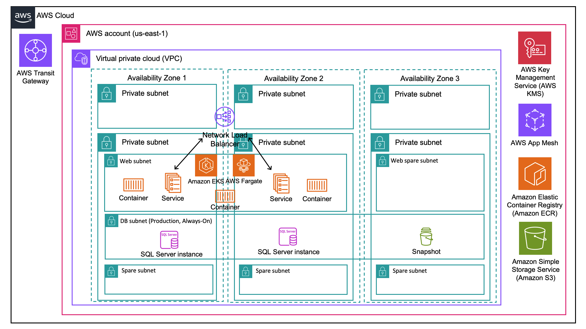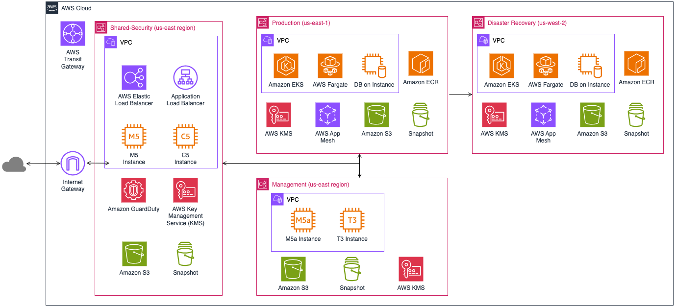 - Resiliency and Disaster Recovery: AWS’s global footprint played a crucial role in Insurity’s migration of the Claims Payments solution to the cloud since high availability, performance, and scalability are important factors for Insurity’s customers. The Production VPC runs on a multi-AZ setup and uses KMS for encryption for EKS, Fargate, and ECR. Insurity also hosts Microsoft SQL Servers running on Amazon Elastic Cloud Compute (EC2) instances, along with AWS App Mesh Internal Network Load Balancers are used within this VPC. The database tables and stored procedures are encrypted, and any PII (Personally Identifiable Information) is also encrypted using the same service. Backups of the data are stored in an S3 bucket.