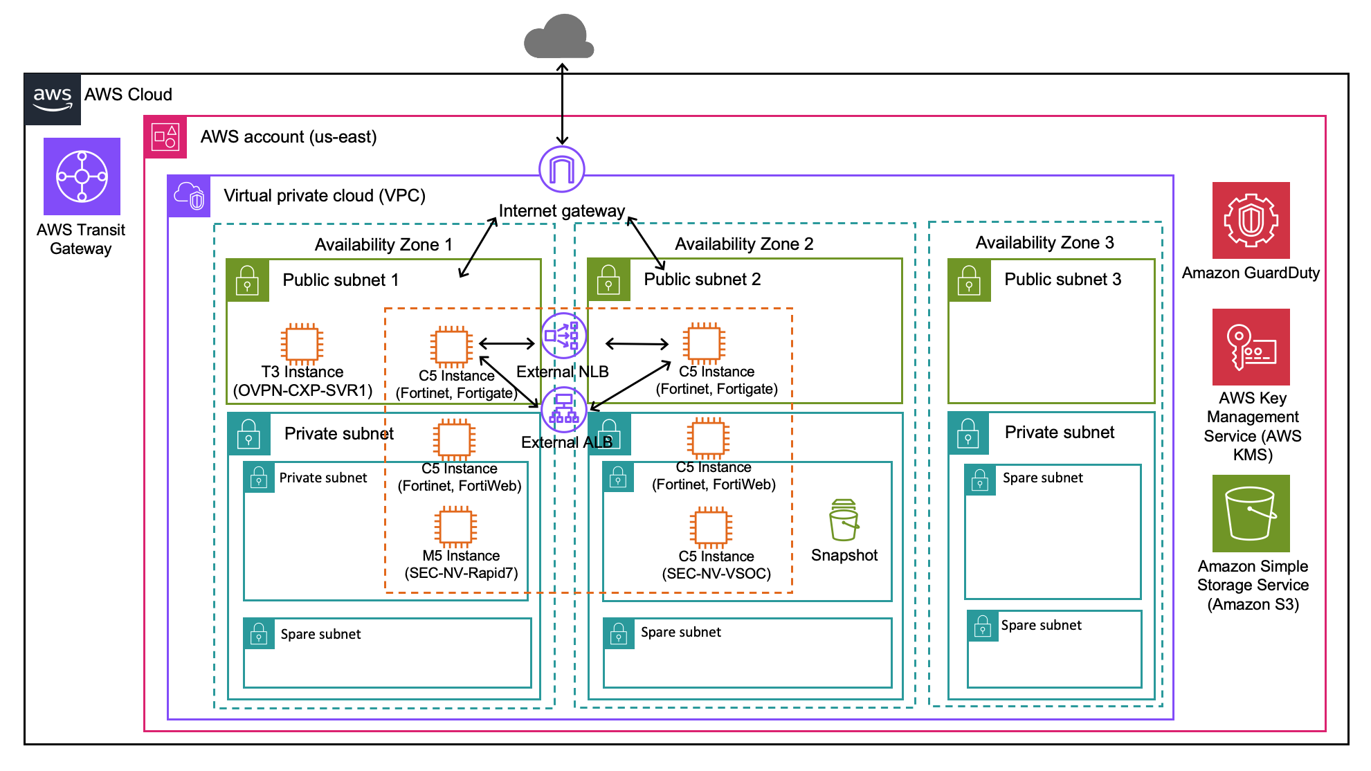 In the shared-security VPC, Insurity deployed Amazon GuardDuty for threat monitoring. VPC flow logs plays a crucial role in securing the traffics. Insurity selected security technology partner solutions – Fortigate, Fortinet, Rapid7, Axonius, openVPN, Observe, CrowdStrike CSPM, and CloudFlare to extend the security footprint provided by AWS within Insurity’s VPC.