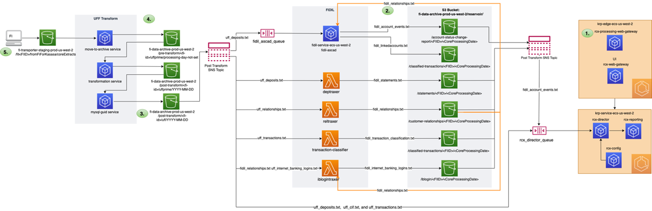 The movement of the core extract files out of the original S3 bucket into a data archive bucket triggers another SNS message that kicks off another service to initiate the data transformation process. This is a critical element of the KRP ecosystem because core extract files have different data schemas depending on the originating core provider.