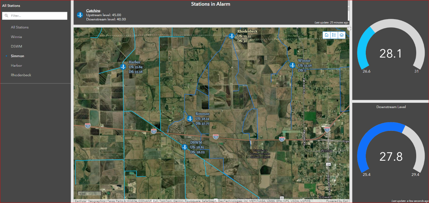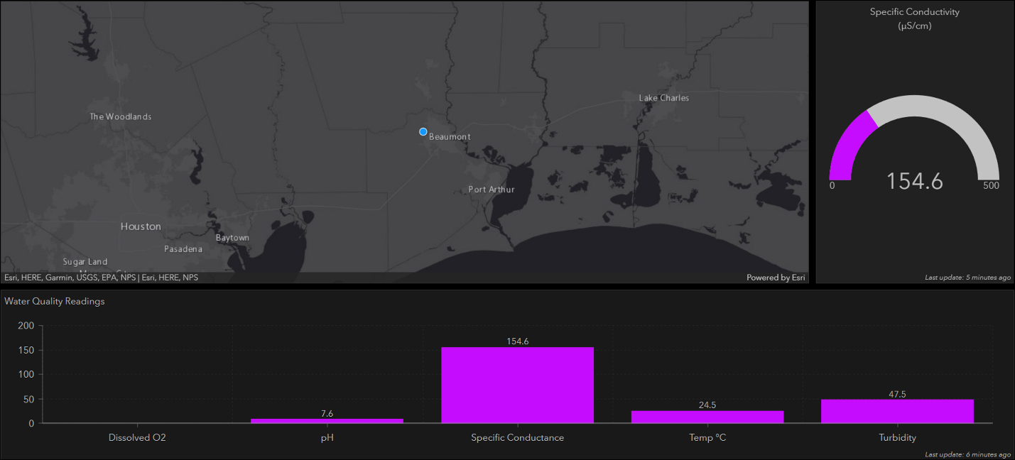Once configured GeoEvent seamlessly ingests the continuous data flow from the remote stations and feeds data to the published feature services. These services populate dashboards within LNVA’s ArcGIS Enterprise environment, providing real-time readings for each site. This increased visibility allows LNVA staff to monitor the entire system remotely, eliminating the need to visit each station for on premises readings.