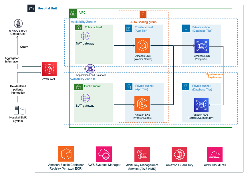 The federated units are identical pieces of infrastructure running in a hospital’s environment. Oncoshot uses infrastructure as code (IaC) to ensure consistent and fast deployment of units in each hospital. Each federated unit includes a Kubernetes cluster running on Amazon Elastic Kubernetes Service (Amazon EKS) and a PostgreSQL database running on Amazon Relational Database Service (Amazon RDS).