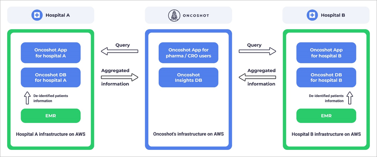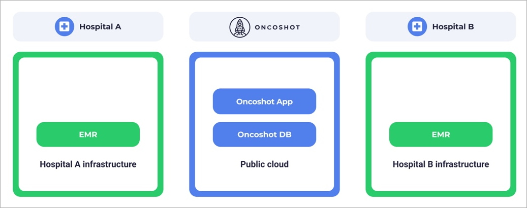 As the focus shifted towards larger hospitals, a centralized solution proved unfeasible. Despite Oncoshot exclusively handling de-identified patient data, hospitals insisted on heightened security measures. Systems that handle patient data in the healthcare sector, such as electronic medical records (EMRs), are typically deployed within a hospital’s infrastructure. Data are retained within the environment rather than being exposed externally.