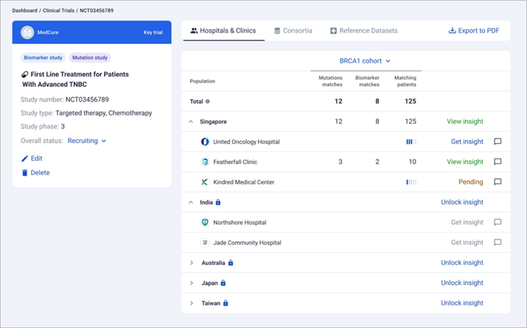 It’s crucial to reiterate that throughout this process, all de-identified patient information remains within the hospital’s AWS cloud infrastructure. Only aggregated patient data is shared with sponsor users in real-time. Below is a screenshot showcasing a study’s insights page. Note that the organizations depicted below are fictitious.
