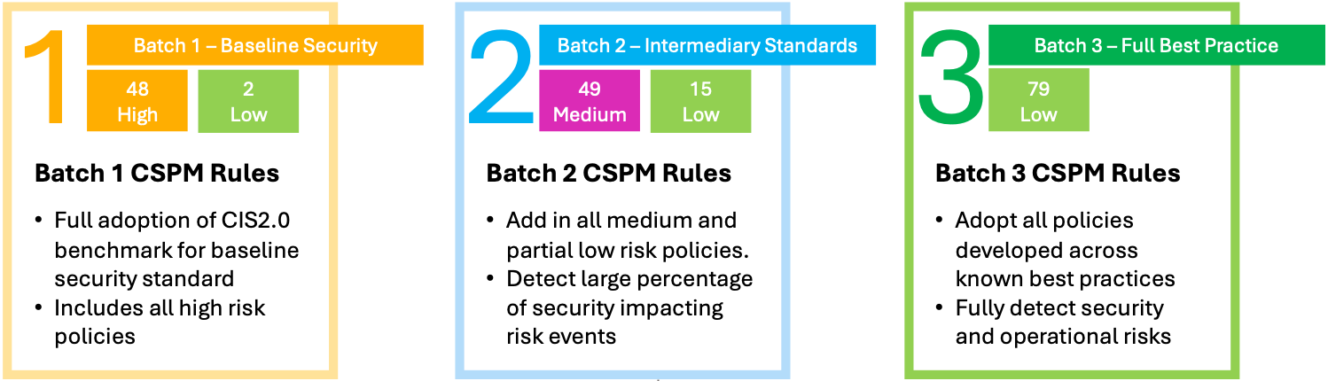 - Batch 3 adopts to the full set of CSPM policies developed according to best practices for comprehensive detection capabilities among security and operations optimization
