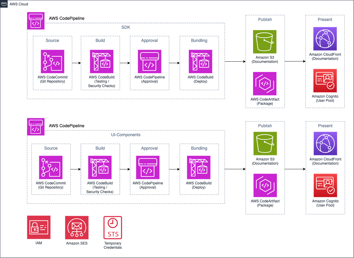 AWS CodeCommit is used for source control management and provides a secure and collaborative environment. AWS CodeBuild compiles and tests code, consistently producing high-quality software packages, and generates the documentation. This documentation is automatically uploaded to Amazon Simple Storage Service (Amazon S3) and presented using Amazon CloudFront.