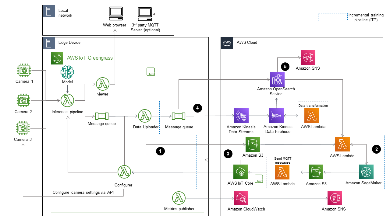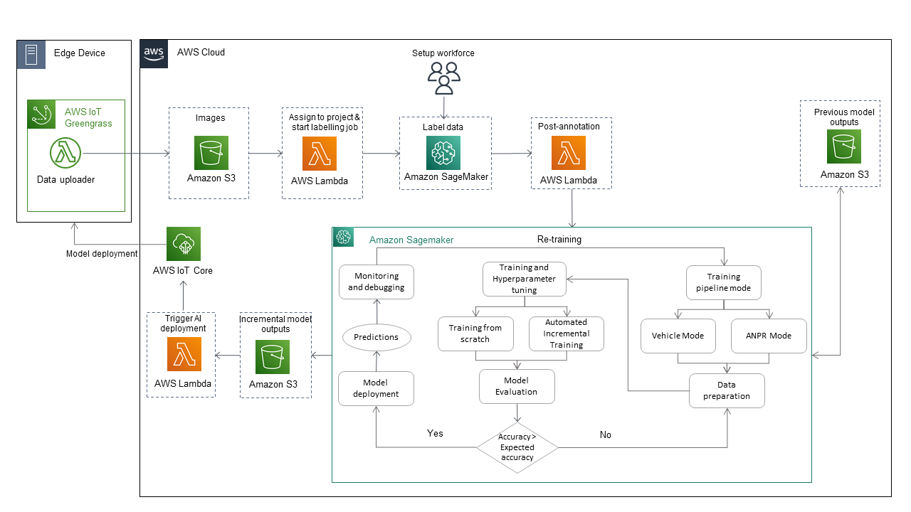 - The Edge device has AWS IoT Greengrass installed. It collects and sends all vehicle images to an Amazon Simple Storage Service (Amazon S3) bucket.