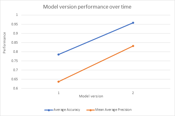 The following figure shows an example of how model performance improved within just one successive iteration, using Tapway’s ITP. The original version of the model (version 1), originally exhibited an Average Accuracy of 0.79 and Mean Average Precision of 0.6, across all digits from the golden test dataset. With the next model iteration (version 2), through the inclusion of more minority class examples and edge-cases, the ITP was able to improve Average Accuracy to 0.96 and Mean Average Precision to 0.83.