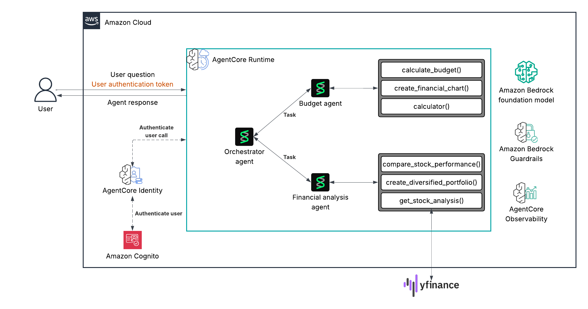 AgentCore is an agentic platform where developers can build, scale and operate AI agents without the need for infrastructure management. Let’s consider the following agentic use case without Temporal where you have created a multi-agent financial advisory system as shown in the following figure: