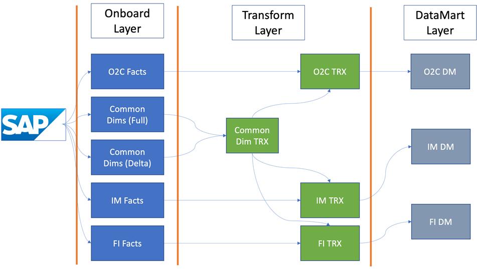 Using a single endpoint, we source the data from SAP into Snowflake partitioning the fact data by use cases; however, we use a common set of dimensions to feed the scenarios. Below is what this architecture conceptually looks like.