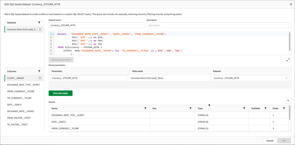 The transform layer is where we start manipulating the data with 100% pushdown SQL to Snowflake. Some example transforms include pivoting currency, flattening descriptive text, and other SQL manipulations.