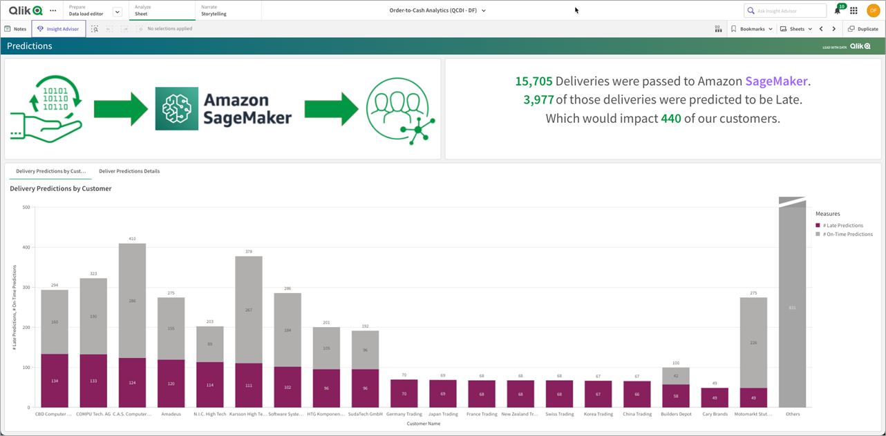 One of the more powerful components of the Qlik SaaS architecture is the ability to integrate the data in the Qlik application with the Amazon SageMaker engine. In our order-to-cash use case, we have taken sample data and trained a SageMaker model to make predictions on late vs. on-time delivery.