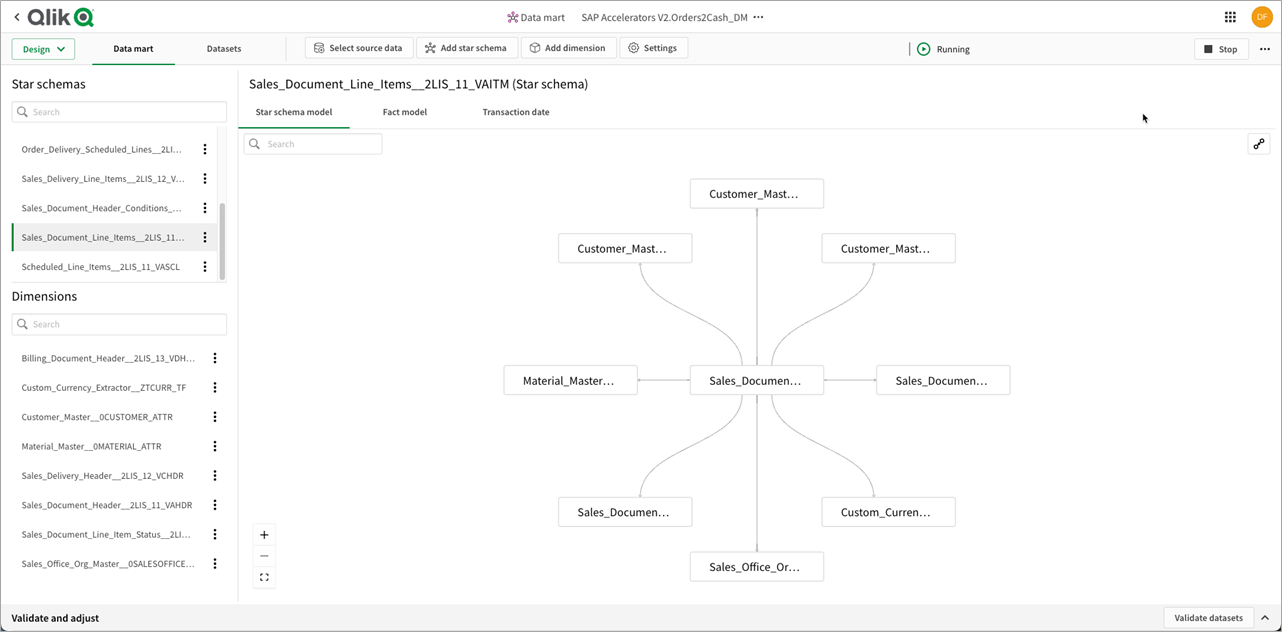 Here’s what the refined analytics model looks like in Qlik SaaS. Notice how there are multiple fact tables (10) sharing that common set of dimensions.