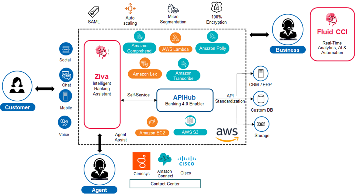 If agent-based interaction is needed, for clients who want to continue staying with existing on-premises or cloud contact centers such as Genesys and Cisco, Ziva works in combination with FluidCCI to transform the customer experience with both AI and analytics capabilities.