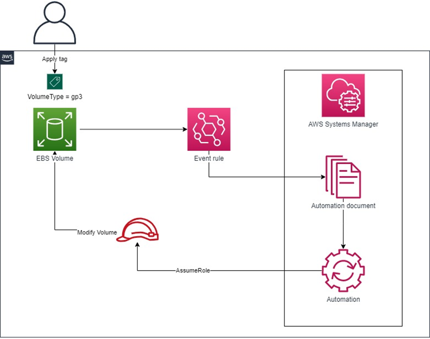 The automatic upgrade of instances from gp2 to gp3 can be achieved by triggering AWS Systems Manager automation by an event from Amazon EventBridge. When someone on your team identifies a volume they would like to be upgraded, they tag the volume and that sends an event to the event bus, triggering the automation workflow.