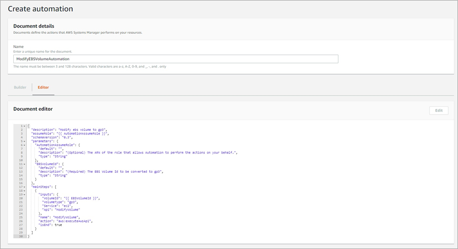 Figure 2 – Creating an Automation document to modify an EBS volume.