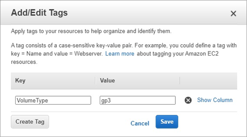 Figure 5 – Adding tags to an Amazon EBS volume.