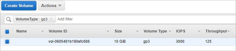 • Refresh the list of EBS volumes and notice the volume type has changed from gp2 to gp3. Usually this happens within a few seconds; if the volume type has not updated, refresh the screen again.