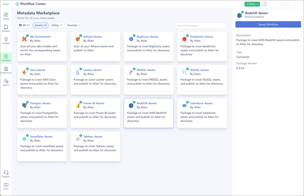 - Select Redshift from the list of options in the integrations tab, and click Setup Workflow.
