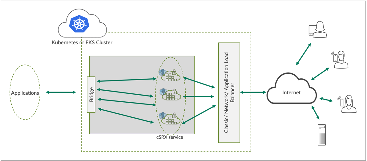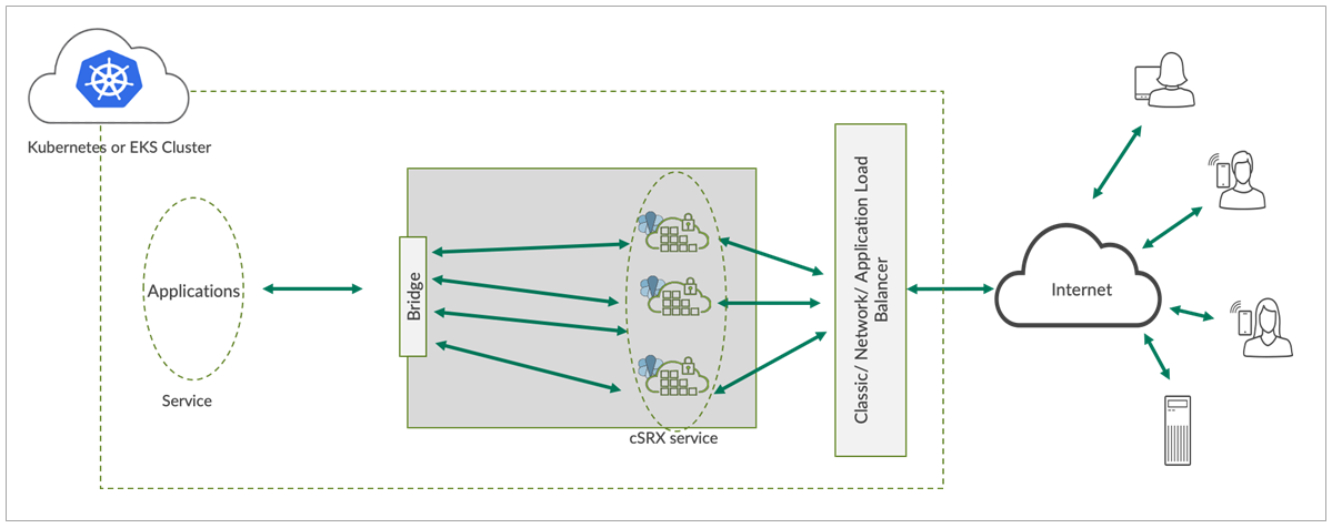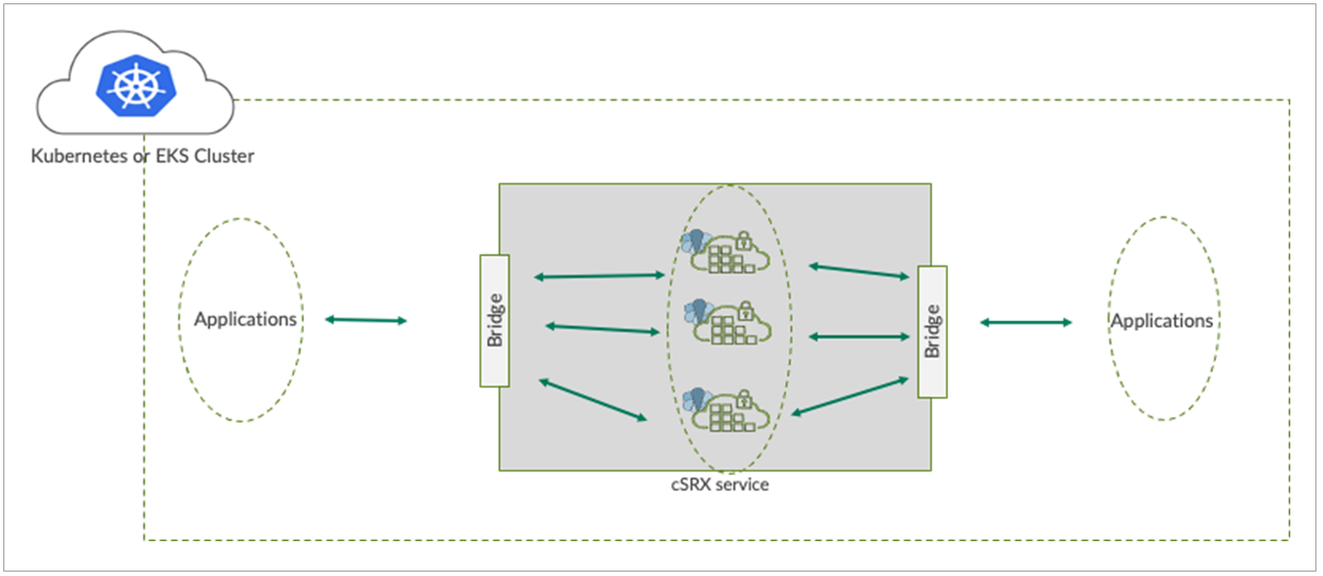In this scenario, the application workloads being protected are deployed within the EKS environment. The cSRX is deployed in a Kubernetes cluster either as a single pod or as part of a deployment and replica-set.