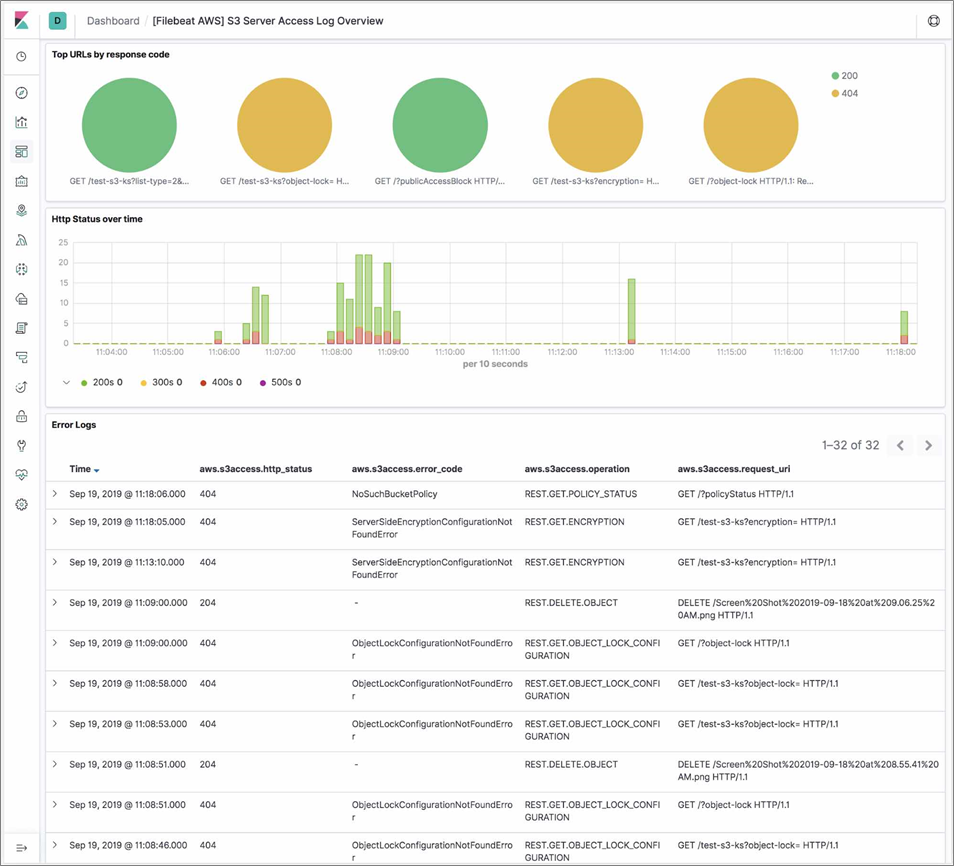 For more information on this, please see the Set up the Kibana dashboards documentation. This dashboard is an overview of Amazon S3 server access logs and shows top URLs with their response code, HTTP status over time, and all of the error logs.