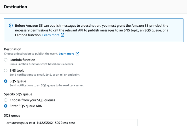 Figure 3 – Destination to publish notification for S3 events using SQS.