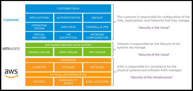 Figure 2 below shows the shared responsibilities between VMware, AWS, and the customer. You are responsible for the configuration of workloads within the software-defined data center (SDDC), VMware firewall rules, and other SDDC configurations.