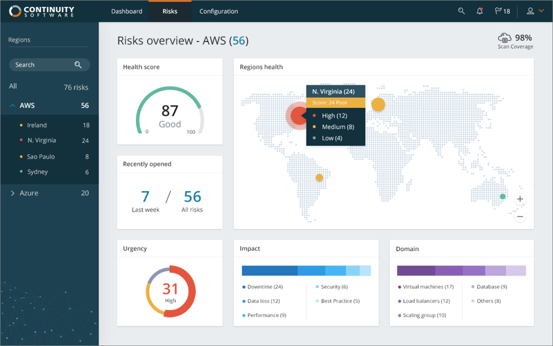 Continuity Software’s resilience assurance solution, AvailabilityGuard NXG, provides IT teams with a proven, simply-initiated, and non-intrusive routine to proactively and consistently pinpoint and repair misconfigurations in your AWS environment that may lead to service disruptions and downtime.