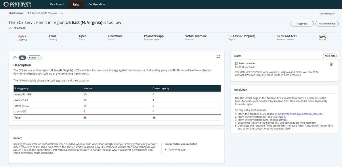 Going back at the sample misconfigurations we described above, you can see in Figure 2 what an Amazon EC2 resources limits risk (example #1) might look like in AvailabilityGuard NXG. The issue here is in the US East (N. Virginia) region, and it affects the payment application with a risk of downtime.