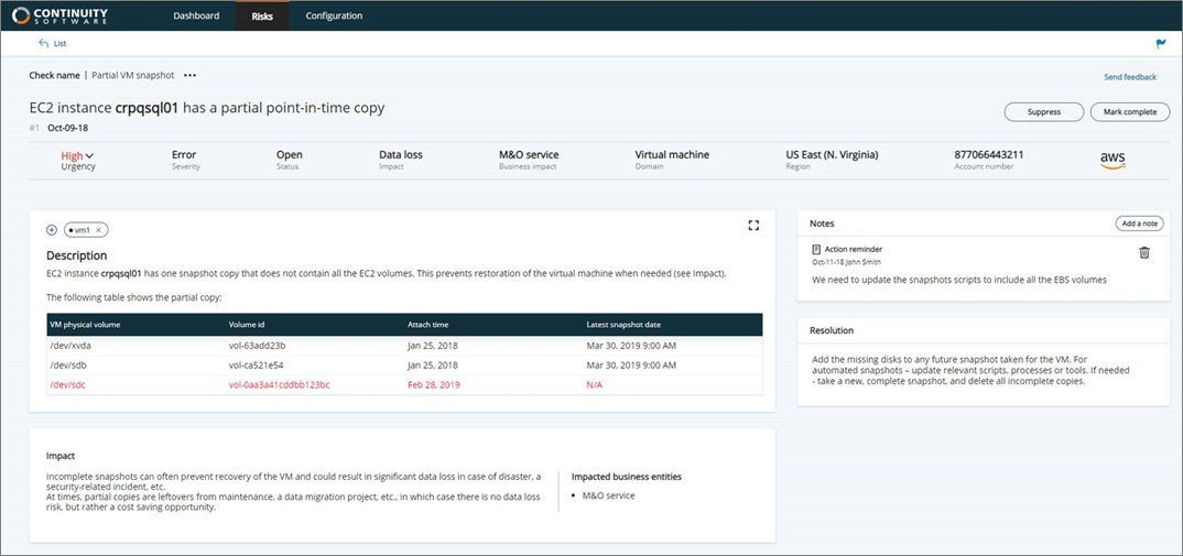 Second, you can drill down to see information about individual risks. Incident tickets include details on parameters affecting resilience, all misconfigurations that must be corrected, business impact, urgency, and guidance on how to correct them.