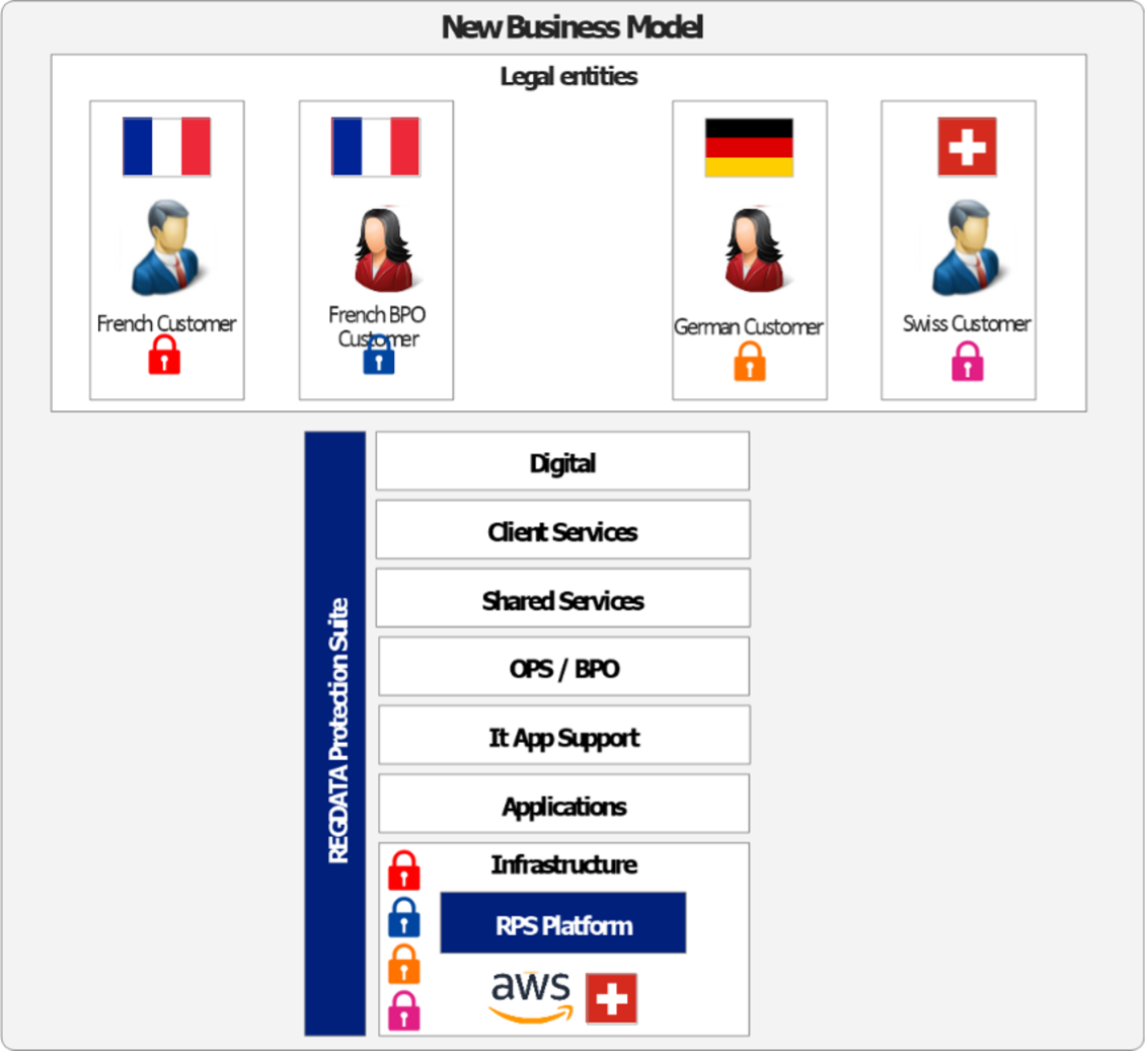 The REGDATA Protection Suite provides a stack of services, starting from Digital services at the top, moving through Client Services, Shared Services, OPS/BPO, IT App Support, and Applications.