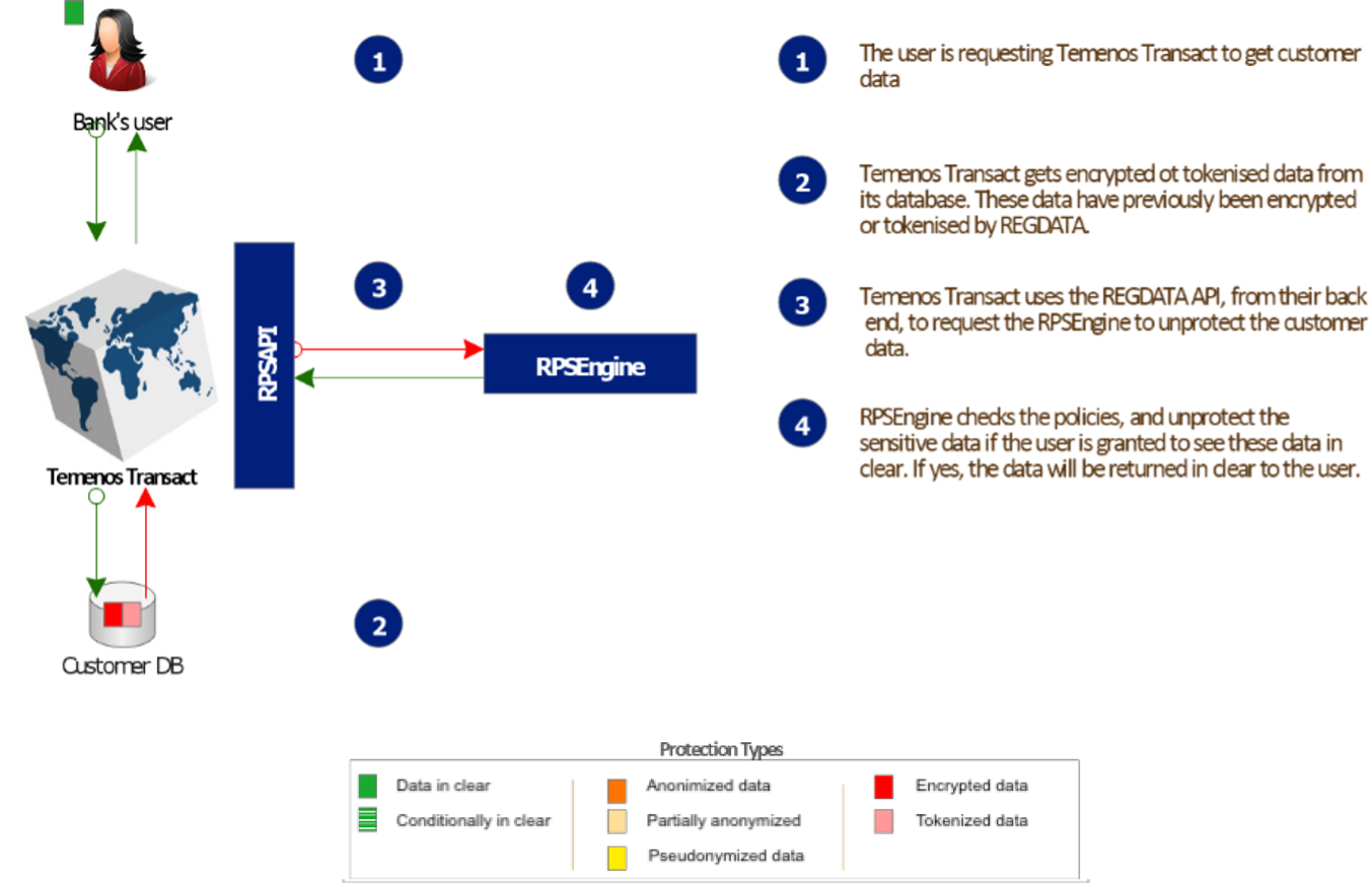 The process begins when a bank user requests customer data from Temenos Transact. The system then retrieves encrypted or tokenized data from its customer database, where REGDATA has previously secured the sensitive information.