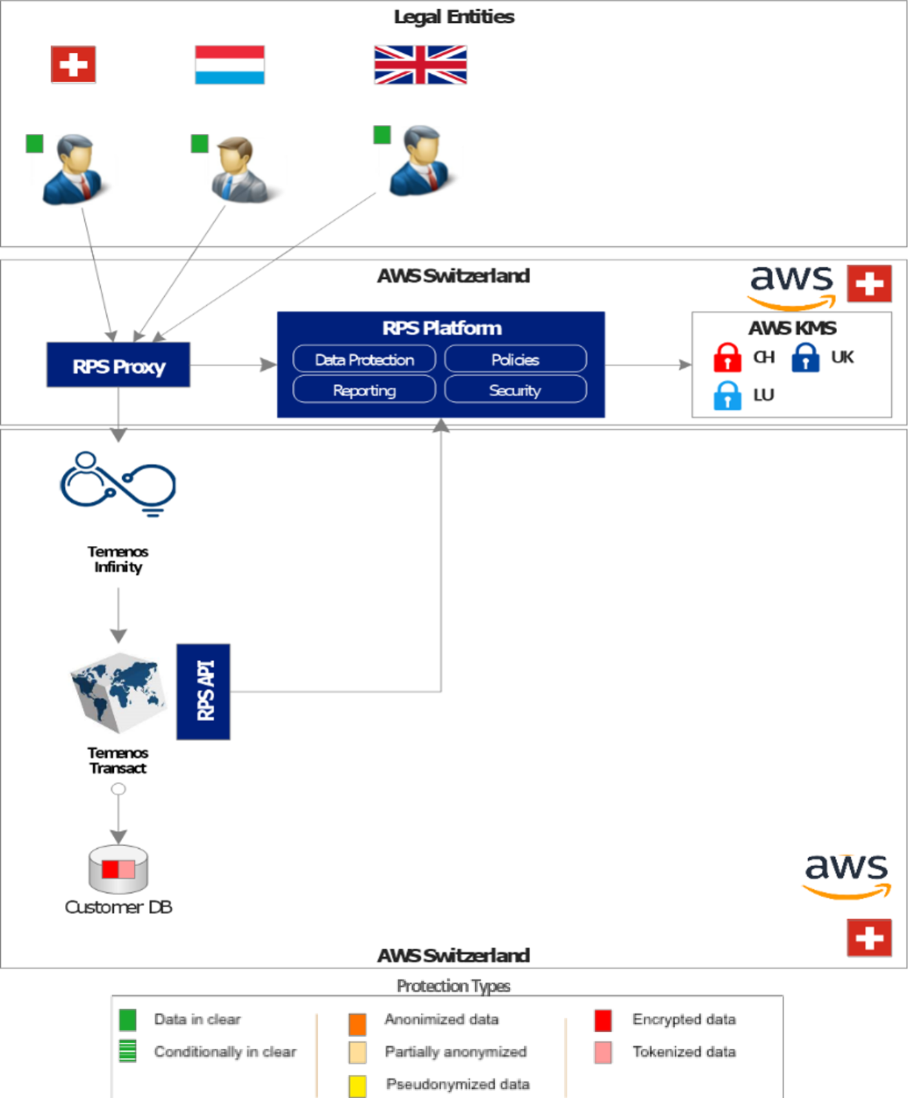 Users access the system through the RPS Proxy, which interfaces with the RPS Platform for data protection, policies, reporting, and security. The system connects with Temenos applications (Infinity and Transact) while maintaining region-specific encryption keys through the Key Management Service.
