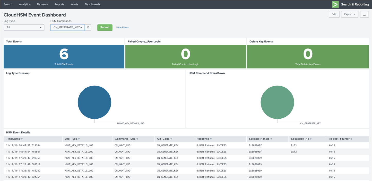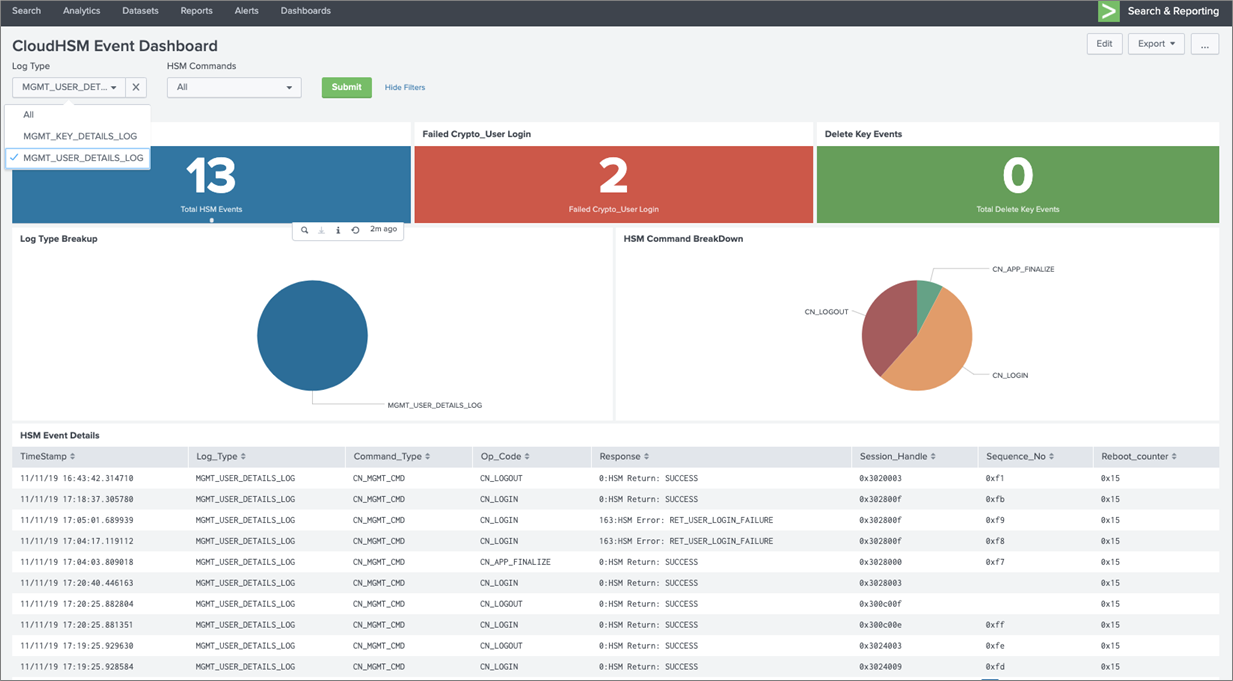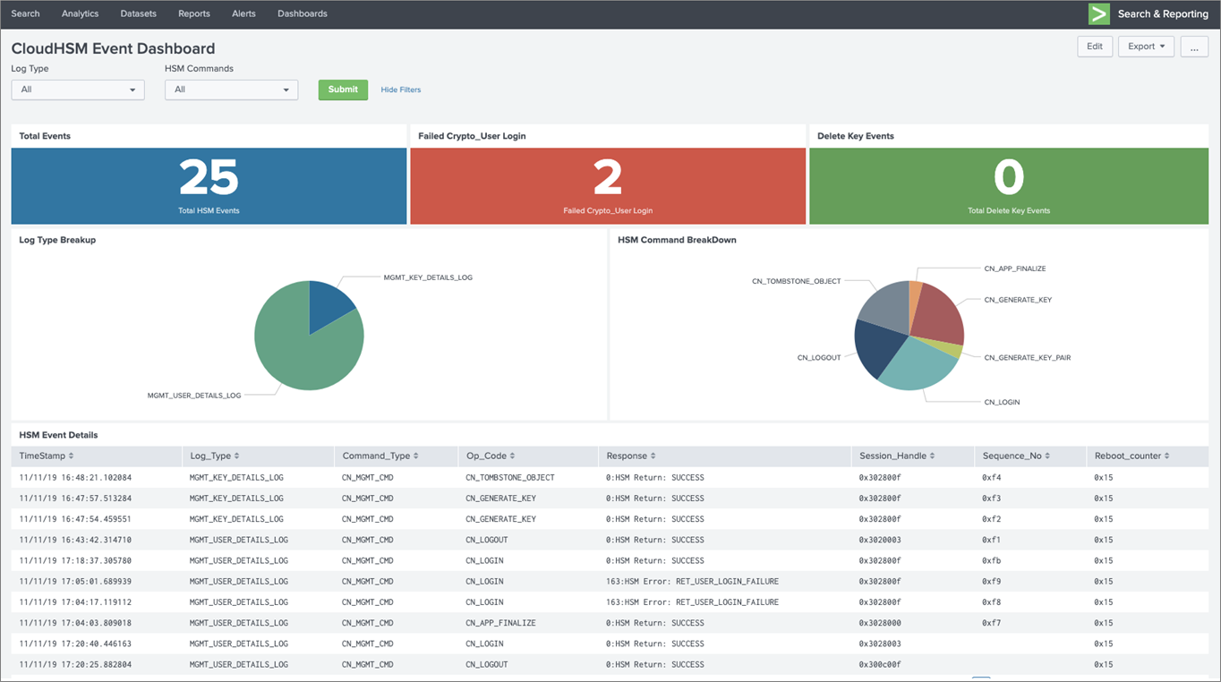 Using this solution, organizations can analyze audit logs generated from CloudHSM to gain visibility into critical activities taking place within the CloudHSM appliance, and build visualizations and dashboards for security or operational requirement.
