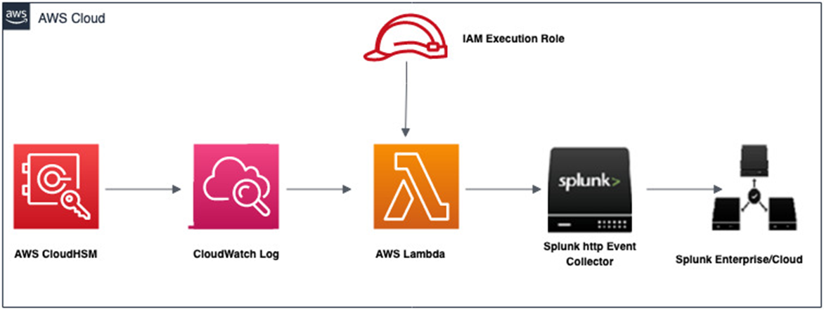 This includes native delivery of audit logs from CloudHSM to CloudWatch, and a Lambda function that receives the events from CloudWatch and sends it to Splunk HEC.