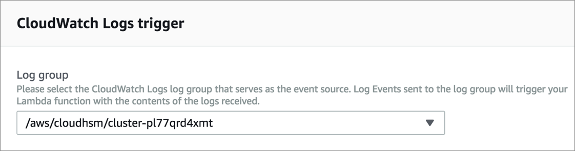- In the CloudWatch Logs Trigger section, select the CloudWatch log group, which is the name of the cluster in your account, and provide a friendly filter name.