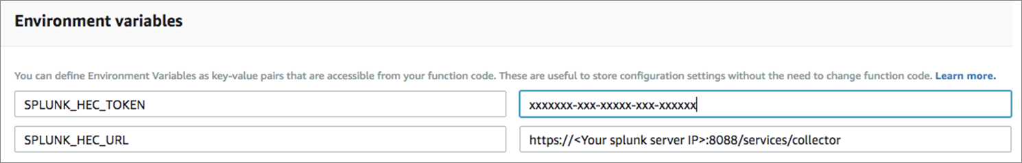 - Provide the HEC token and HEC URL in the Lambda environment variable and click Create Function.