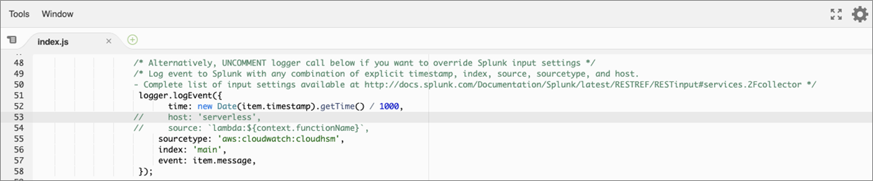 - Edit your newly-created Lambda function, and uncomment the source code as shown below.