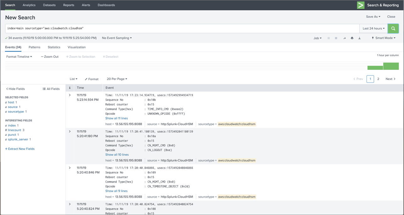 Below, you see the audit events gets displayed in Splunk when a search with sourcetype aws:cloudwatch:cloudhsm is executed.