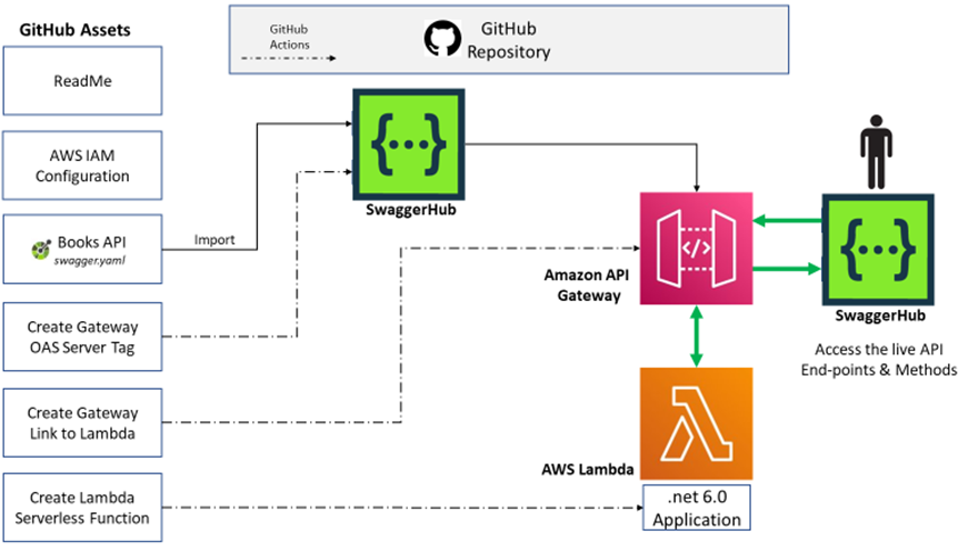 To understand the API delivery cycle, you can create an OpenAPI definition and put it into GitHub, which acts as the continuous deployment system. Changes in your source control repository trigger deployments to an API Gateway that proxies requests to a Lambda function. While this solution uses a design-first approach, it can be adopted to support code-first projects that generate API definitions from code.