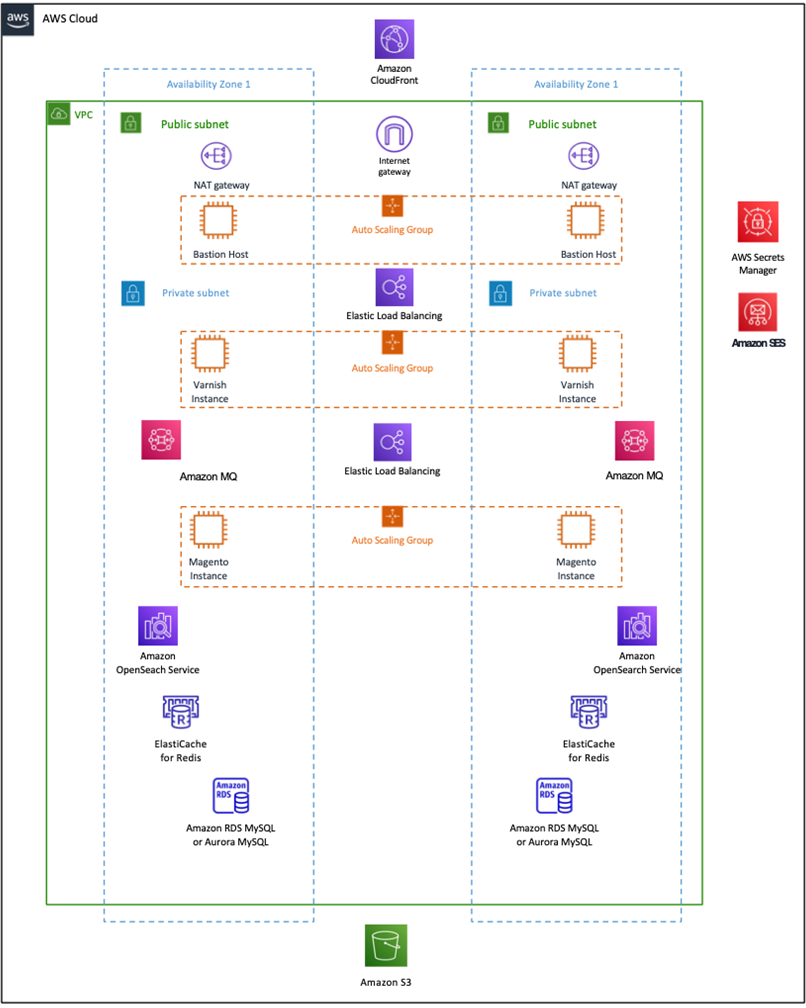 - Amazon Simple Storage Service (Amazon S3): Stores the Magento data.