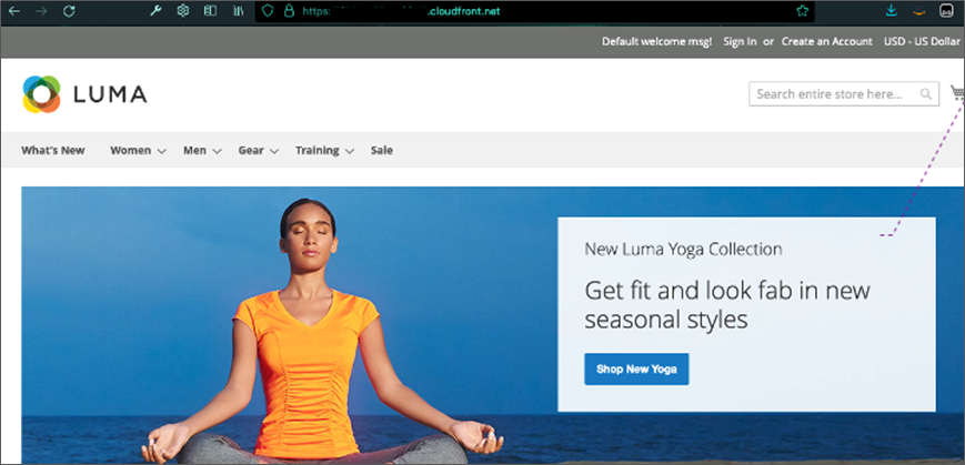 The following image is the Adobe Commerce home page that’s available after deployment. An administrative portal is also available for you to manage your new ecommerce site.