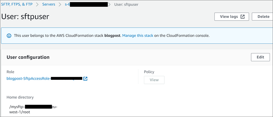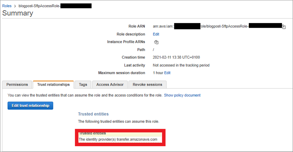 This IAM role has the SftpAccessPolicy attached, which gives the required rights to put, get, and delete files in the root folder of the bucket.