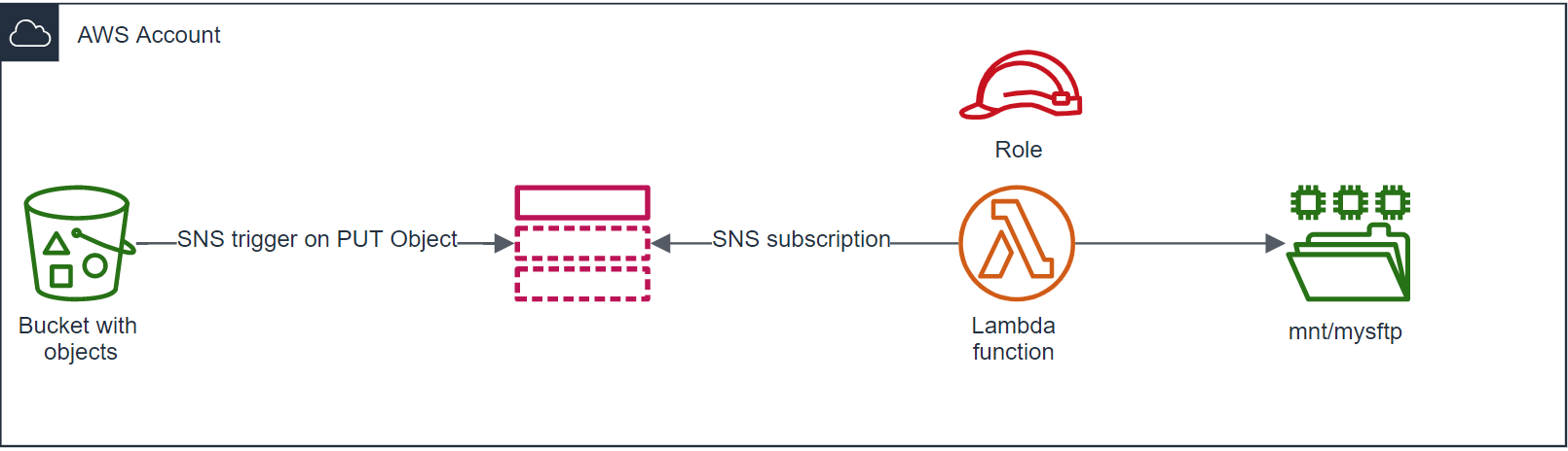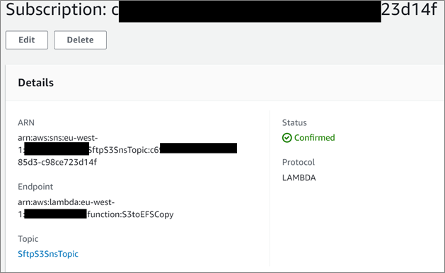 - An SNS function subscribes to this topic and copies a newly-created file to an EFS mount. AWS Lambda copies from S3 to EFS.